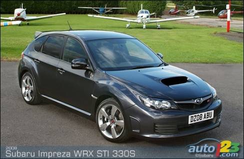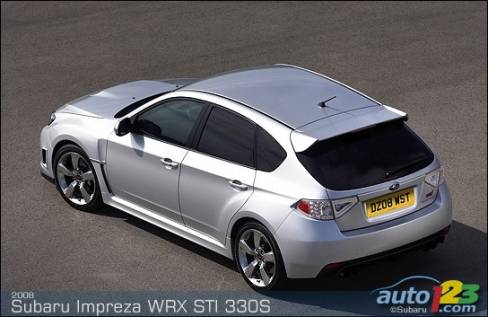 Europeans looking for more power will now have the Impreza WRX STI 330S. Under the hood is a turbocharged engine producing 330 horsepower at 5,400 rpm and 347 pounds-feet of torque at 6,000 rpm. Accelerations from 0 to 60 mi/h (96 km/h) have been clocked at 4.4 seconds. In addition to all the features of the regular STI, this upgraded model gets leather-wrapped Recaro sports seats, a navigation system and keyless entry.