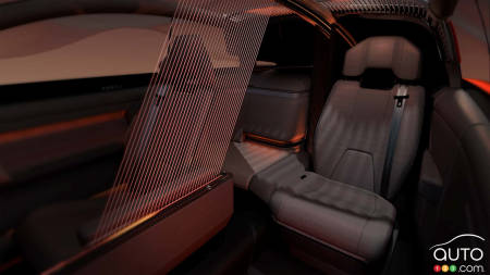 The interior pushes the limits of automotive design: the driver's seat is isolated from the rest of the cabin by a wooden console and a partition of red lasers projected to the headliner. In front, a futuristic steering wheel, digital instruments, and a seat with a wooden back. The passenger seat, meanwhile, is set back towards the rear to offer a private chauffeur experience in a two-seater — a typically Japanese idea where the comfort hierarchy is inverted.