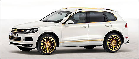 The Touareg Gold Edition would certainly be able to handle a journey around the world – but bear in mind, this car should only be parked where there is good surveillance. That is because – living up its name - certain areas of this SUV are upgraded with 24-carat gold. On the outside, they include the custom designed 22-inch wheels, roof rails, protective guard strips and window frames, mirror caps and parts of the air intake frame, "Touareg V8" signature and boot sill trim. Like the Race Touareg 3 Qatar, this SUV is also painted in "Magic Morning" body colour.