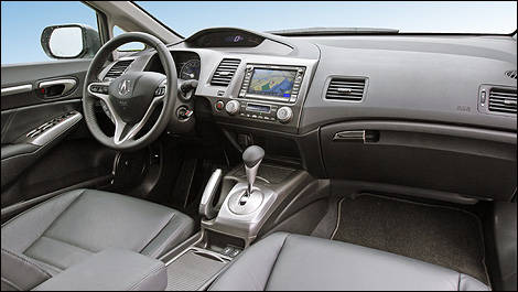 Le tableau de bord copie conformément celui de la Civic. Naturellement, dans la CSX Tech, il a été réaménagé pour loger l’écran d’un système de navigation par satellite. Un accessoire optionnel qui ne figure pas au catalogue de la Honda. L’inclinaison plutôt forte de cet écran rend toutefois sa lecture difficile lorsque le soleil plombe à l’intérieur de l’habitacle, par le toit ouvrant vitré (de série), causant des reflets gênants.