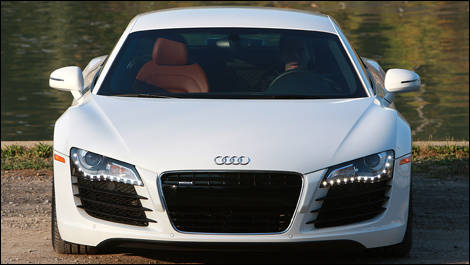 Le soir, quand vous déverrouillez la R8, deux petites lumières illuminent le moteur qui est entièrement visible à travers la lunette. Les feux de jour à DEL procure une indication facile qu'une Audi vous poursuit.
