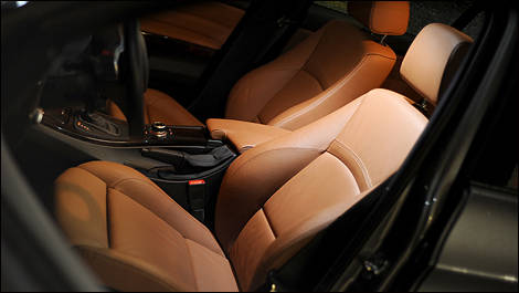 À l’intérieur, la 335d témoigne d’un beau fini, avec sa sellerie de cuir brun, ses composants de grande qualité ainsi que son assemblage solide. L’habitacle commence à se faire vieux, cependant, et demeure un peu trop conservateur. Tel que mentionné dans les essais précédents de la Série 3, on déplore un espace à l’arrière étroit, tandis que les entrées et sorties s’accomplissent péniblement.