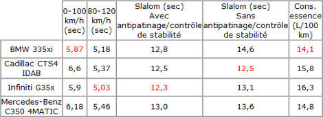 Les 304 chevaux du V6 à injection directe procure des accélérations rapides, mais la lourdeur de la voiture fait en sorte qu'elle soit la plus lente du groupe : il s'agit d'un écart négligeable, toutefois. Le mode manuel de la boîte de vitesses n'est pas le plus rapide en exécution. En revanche, la direction et la tenue de route compensent largement pour le poids de la CTS, ce qui nous a agréablement surpris.