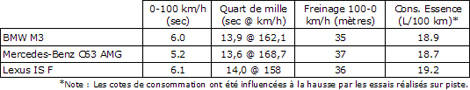 Ainsi, en accélération brute, la M3 réussit le 0 à 100 km/h en 5,65 secondes, tout en fournissant la meilleure performance au freinage, s'arrêtant en 35 mètres seulement. Certains essayeurs ont cependant dénoté la difficulté de tirer le maximum de la voiture au départ, handicapé par un couple maximal disponible à plus haut régime. Notons également qu'il s'agissait de la seule boîte de vitesses manuelle du groupe.