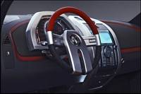 mais aussi dans le choix de ses matériaux. Pour débuter, le tableau de bord, avec sa partie centrale flottante, propose un design plutôt ingénieux qui pivote à angle; celle-ci talonne la console ultra mince que l'on retrouve dans les Volvo S40/V50/C70. Juste au-dessus, le Rampage intègre un système de console au pavillon qui propose des espaces de rangement et des affichages à LCD pivotants, bordés de chaque côté par un panneau de toit panoramique en verre. L'habitacle a un thème de couleurs d'orange vive et d'anthracite, et utilise des matériaux comme des tissus recouverts de polyuréthane afin de s'assurer que le tableau de bord, les panneaux et les sièges soient confortables, durables et faciles à nettoyer.