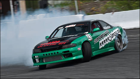 Sitôt le vainqueur de la première ronde Pro-Am annoncé, Francis Tassé retourne au volant de sa Nissan 240SX V8 8 et célèbre sa victoire en faisant lever un immense nuage blanc de caoutchouc brûlé tout autour de l’Autodrome Montmagny !