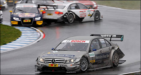 Matthias Ekström (Audi A4) s’est imposé sous la pluie à Oschersleben devant son équipier Martin Tomczyk, parti 15e. Catastrophe pour Bruno Spengler (Mercedes Classe C), contraint à l’abandon après un problème technique.