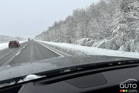Notre véhicule d'essai était livré sur des Continental CrossContact LX25 (4 saisons). Évidemment, Dame Nature a décidé de recouvrir l’autoroute qui relie les deux plus grandes villes de la province de neige. Nous étions inquiets.
