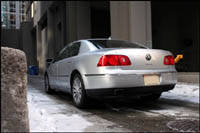 Certains pensent qu'il y a quelque chose qui ne cadre pas très bien à propos de son apparence, qu'elle pèche jusqu'à un certain point au niveau de sa ligne, de sa prestance. Le problème n'est pas sa grosseur, car avec une longueur dépassant les cinq mètres, elle est aussi imposante que les grandes berlines de luxe. Ce n'est pas non plus un manque dans le soucis du détail propre à une voiture de ce prix; les joints de carrosserie ont passé le test du toucher de Bernd Pischetsrieder lui-même, et les soudures sur le toit sont si étroites et si fines qu'il n'est même pas nécessaire de les recouvrir d'une moulure. C'est sans compter ces élégantes roues, les sorties d'échappement affleurantes et les jambes de force en aluminium poli qui supportent les quatre coins de la voiture. Je suppose qu'elle est un peu dénudée, qu'elle est trop réservée, mais si j'avais 100 000$ à dépenser, je ne voudrais pas conduire une automobile dont la carrosserie semble avoir été sculptée par un designer qui a brandi une machette les yeux bandés.