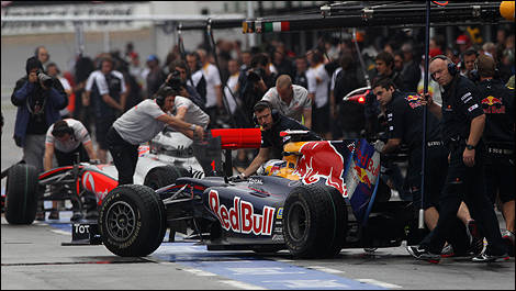 | La Red Bull de Sebastian Vettel dans les puits. (Photo: WRI2) |