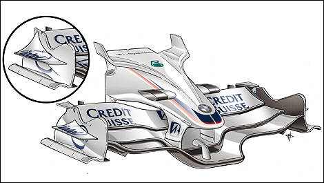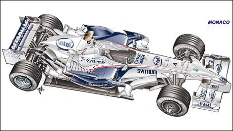 Willy Rampf : « Monaco exige des appuis maximums. Cela signifie que tous les éléments aérodynamiques doivent générer une charge verticale maximale, quitte à générer beaucoup de traînée. Nous utilisons un aileron avant qui produit le plus d'appui possible. Des petits déflecteurs de l'aileron influencent beaucoup l'écoulement de l'air autour des roues avant. Nous avons aussi monté des petits ailerons en T à l'avant des roues arrière. L'aileron arrière, fixé à la boîte de vitesses par des supports verticaux, possède la plus forte inclinaison de toute la saison. Nous avons aussi utilisé pour la première fois les déflecteurs de roues qui généraient un peu d'appui aérodynamique ».