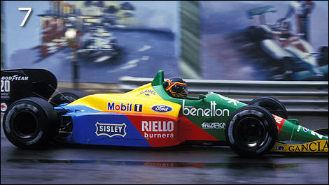 | 1988 Benetton B188 Ford – On voit ici Thierry Bousten au volant de la Benetton B188 à moteur Ford dans les rues de Monaco. La décoration bariolée faite de vert, jaune, rouge et bleu n'était pas du meilleur effet. |