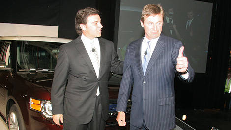 | Le légendaire hockeyeur canadien, Wayne Gretzky (à droite), et le président pour les Amériques de la Ford Motor Company, Mark Fields, ont inauguré la production du Flex 2009 à l'usine Ford d'Oakville, en Ontario. |