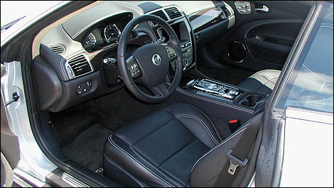 Au lieu d’un levier de vitesse traditionnel, on a droit au sélecteur JaguarDrive, une molette qui s’élève de la console centrale quand on appuie sur le démarreur. D’une extravagance évidente, son côté gadget diminue presque l’élégance sensuelle de l’habitacle.