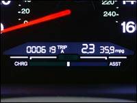 Par ailleurs, il y a un indicateur du niveau de charge, comme sur tous les autres véhicules hybrides, mais cet indicateur est plus petit et plus difficile à lire que sur tous les véhicules hybrides que j'ai essayé dans le passé. Il semble donc que les ingénieurs de Honda ont voulu faire en sorte que l'on soit le moins conscient possible des fonctions hybrides de cette voiture. En fait je serais même porté à croire que toute cette gestion de l'économie dont j'ai parlé auparavant soit de plus en plus faite par l'ordinateur et de moins en moins par le conducteur et que cela ait été voulu par le