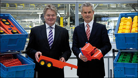 | De gauche à droite: Siegfried Bülow, président du conseil d'administration de Porsche Leipzig GmbH, et Eberhard Weiblen, président du conseil d'administration de Porsche Consulting GmbH, à l'ouverture de l'usine modèle à l'usine d'assemblage de Porsche à Leizpig, le 29 septembre 2009. |
