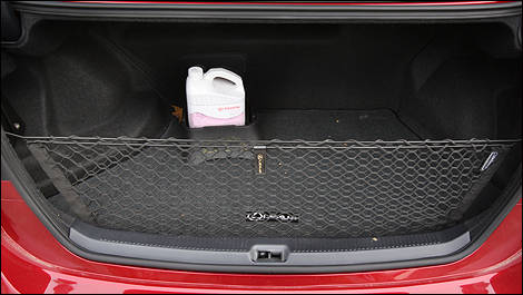 | Le coffre, qui a un volume utile moyen, n’est pas modulable puisque la batterie est logée derrière le dossier de la banquette arrière. |