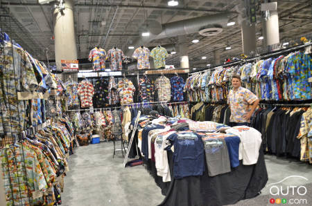 Dans tous les salons automobiles, on retrouve des kiosques de marchands locaux qui espèrent faire connaître leurs produits au public et réaliser quelques profits pendant les journées d’ouvertures. Lors de la journée des médias, les responsables de ces derniers travaillent à les monter et ne sont pas vraiment l’objet d’attentions particulières. À chacune de nos visites à Los Angeles, on se réserve un temps pour aller rencontrer certains commerçants comme ce spécialiste de chemises très… californiennes, High Seas Trading Co. Une croisière, quelqu’un ?