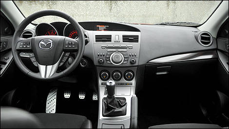 La carapace de la Speed3 est essentiellement reprise du modèle régulier, et on peut dire de même pour l’habitacle. Évidemment, ce qui distingue la Speed, ce sont les grands sièges sport avant, le tableau de bord et les portières rouge et noir, les pédales en aluminium et les coutures rouges ici et là. Pour le reste, la 3 ne sort pas de l’ordinaire. Dans les faits, la Speed correspond à l’équivalent de la Sport GT avec ensemble GT-E rehaussée d’éléments variés provenant des groupes d’options « Confort » et « Luxe ».