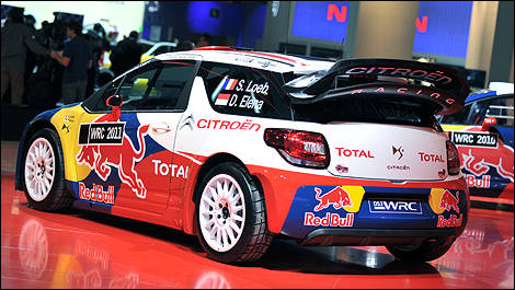 Citroën présente une section course où trône une C4 WRC, bien connue, mais surtout sa toute nouvelle arme du Championnat du monde des rallyes, la très belle DS3, équipée du nouveau moteur 1,6 litre turbo à injection directe, capable de produire 300 chevaux !