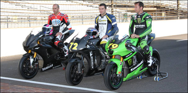 | Les pilotes d'essai William Costes of Yamaha (g.), Erwan Nigon de Honda et Olivier Jacque de Kawasaki. |