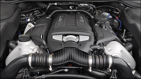 | Le monstrueux V8 turbo de 4,8 litres du Cayenne et ses 500 chevaux, ne se montrait guère intimidé par les tentatives ratées de la S. (Photo: Mathieu St-Pierre/Auto123.com) |