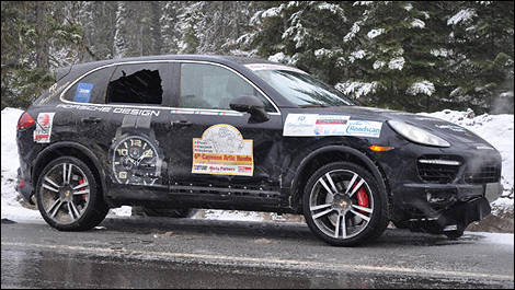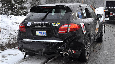 La deuxième journée sur la route, comme le groupe progressait de Prince George à Fort Nelson, une neige fondante s’était abattue sur le pavé et le rendait plutôt glissant. Le véhicule de tête, un Cayenne Turbo 2011, a dépassé un semi-remorque lent, et au moment où le conducteur s’apprêtait à regagner sa voie, il a perdu le contrôle du VUS de 500 chevaux.