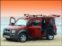 L'Element a été initialement conçu pour répondre aux besoins des jeunes de moins de 30 ans s'intéressant à la planche à neige, au surf, au vélo de montagne et à d'autres activités du genre. Il s'agit d'un véhicule qui ne fait pratiquement aucune concession au stylisme alors que tout est défini en fonction d'une utilisation pratique. Comme le cube est le meilleur moyen de transporter les objets les plus encombrants, c'est la forme adoptée par cette Honda, dont la plate-forme et les composantes mécaniques sont essentiellement empruntées au CR-V. Les stylistes ont quand même réussi à donner à l'Element une personnalité propre. On l'a également doté d'un panneau d'accès arrière latéral de type "suicide" afin de faciliter le chargement des objets. Tout dans l'habitacle a été adapté à la vocation pratique de ce cinq-portes : les sièges sont recouverts d'un tissu imperméable, les deux banquettes arrière peuvent être repliées le long de la paroi et même enlevées au besoin. De plus, le plancher est recouvert d'un épais tapis en caoutchouc qui facilite le nettoyage. À l'arrière, une porte inférieure à battant facilite le chargement tandis que la partie supérieure est un hayon muni d'un essuie-glace. Les dimensions extérieures de l'Element sont modestes, mais on peut y mettre facilement deux vélos de montagne sans avoir à en retirer les roues avant, une planche de surf pleine longueur, des skis ou nombre d'objets encombrants. Le moteur, un quatre-cylindres de 2,4 litres produisant 160 chevaux, assure des accélérations dans la bonne moyenne. Une version à transmission intégrale est offerte avec une boîte automatique, mais on pourra la commander d'ici quelques mois avec une boîte manuelle à cinq vitesses.
