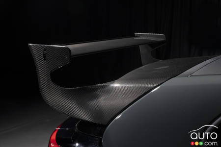 À l’arrière, on retrouve un aileron arrière en fibre de carbone. Celui-ci rehausse considérablement l’appui aérodynamique de la voiture. Elle est aussi munie d’un diffuseur à l’avant, de jupes latérales ainsi que d’un capot en fibre de carbone.