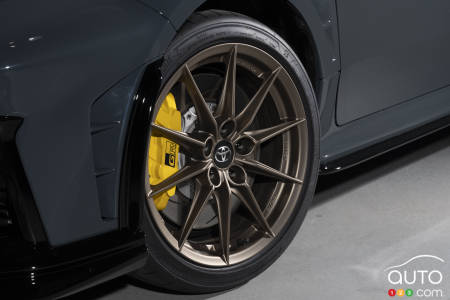 Quant à la peinture de la carrosserie, elle est de couleur Gravel Khaki. Cette teinte est exclusive à la GR Yaris Morizo RR. Les étriers de frein de même que les surpiqûres à l’intérieur sont de couleur jaune afin d’assurer un contraste et de respecter la signature stylistique de Morizo. La voiture est dotée de jantes de couleur bronze mat.