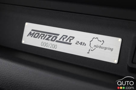 À l’intérieur, on retrouve un volant dont le diamètre est légèrement réduit en comparaison avec la GR Yaris. Les palettes de changement de rapports ainsi que certaines autres commandes ont été retravaillées afin d’optimiser leur utilisation en conduite sportive. Une plaque “MORIZO RR” indique le numéro de série de la voiture.