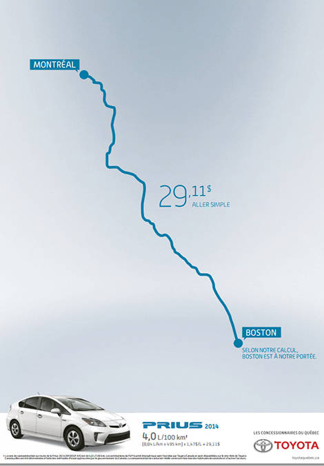 Ainsi, comme plusieurs amateurs feront ce soir le trajet Montréal-Boston pour assister à la rencontre, Toyota a publié un graphique montrant le trajet entre les deux villes ainsi que la faible consommation de carburant réalisée par une Prius qui se rendrait à Boston.