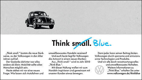 La nouvelle campagne publicitaire fait le pont entre le passé et l’avenir, reprenant le fil de la campagne « Think Small » qui avait accompagné le succès international triomphal de la Beetle en tant que voiture du peuple dans les années 60. « Le slogan "Think Small" symbolise le succès de Volkswagen dans la démocratisation du transport aux quatre coins de la planète. Le défi de l’avenir sera d’offrir à tous et chacun un moyen de transport efficace et durable. Volkswagen a l’intention d’ouvrir la voie. C’est ce que la campagne exprime, "Think Small" devenant "Think Blue" », conclut M. de Meo.